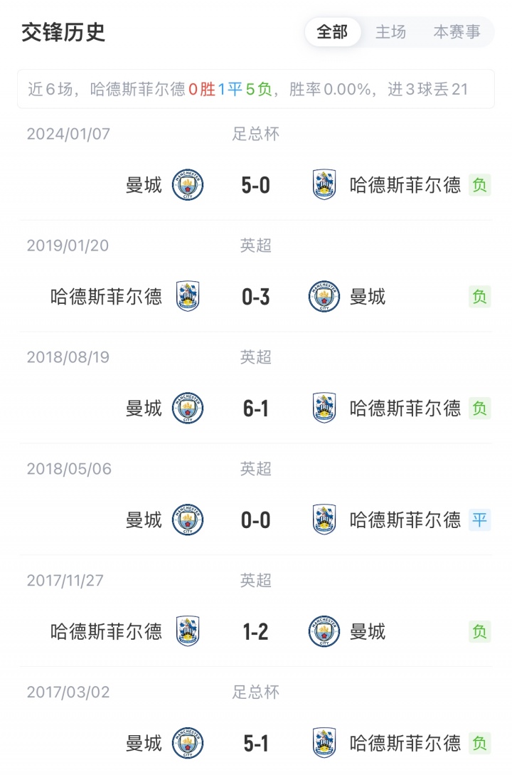 曼城联赛2胜1平2负积7分暂位英超第9,近3场不败;哈德斯菲尔德联赛5胜1平3负积16分暂位英甲第5,近2轮不胜。曼城历史7场对阵哈德斯菲尔德从未败绩(5胜2平)。