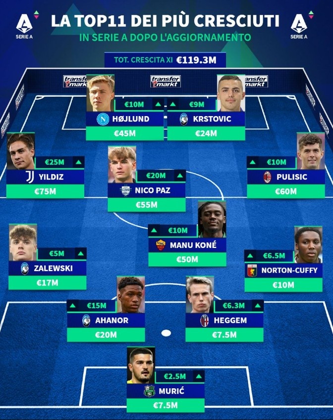 意甲球员身价涨幅阵:霍伊伦、普利西奇、伊尔迪兹、帕斯在列