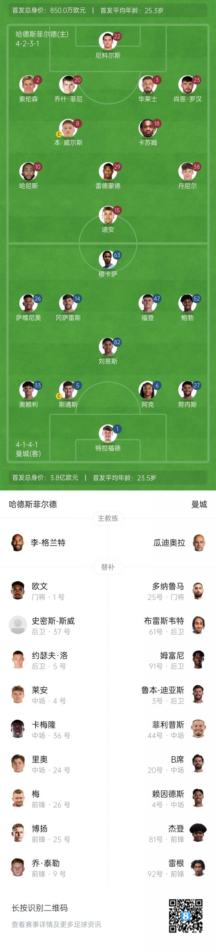 哈德斯菲尔德替补:1-古德曼、37-史密斯-斯威、5-约瑟夫-洛、4-莱安、36-阿西亚、24-卡斯尔丁、26-梅、25-拉杜洛维奇、9-乔-泰勒